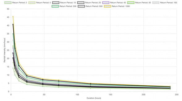The system uses IDF curves to represent precipitation intensities as a function of duration and return period. An IDF curve shows how rainfall intensity changes over time and varies according to event frequency. The figure below illustrates an example of an IDF curve for a region, depicting the characteristics of different possible rainfall events.